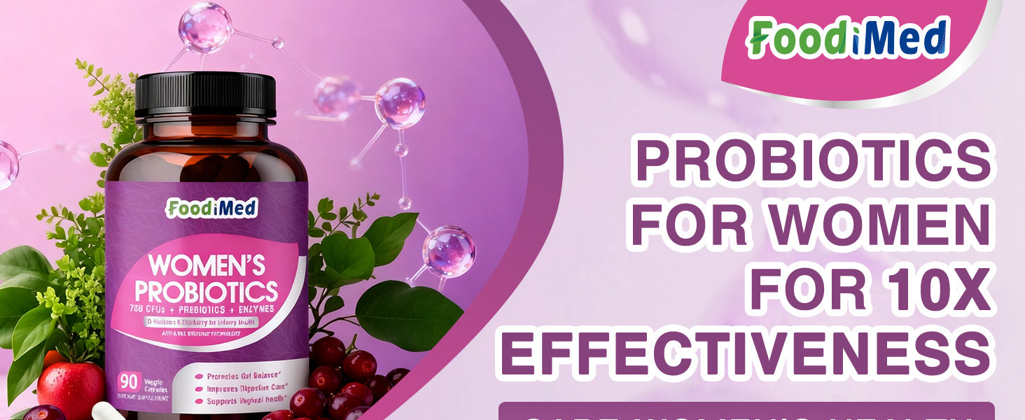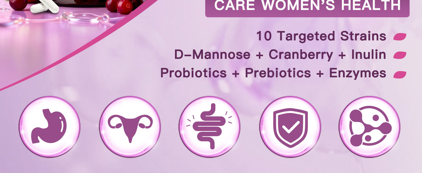 Daily women's probiotic with prebiotics, enzymes, and a wellness blend, plus Vitamin C, D-Mannose, and Cranberry Extract for digestive, vaginal, and immune health.