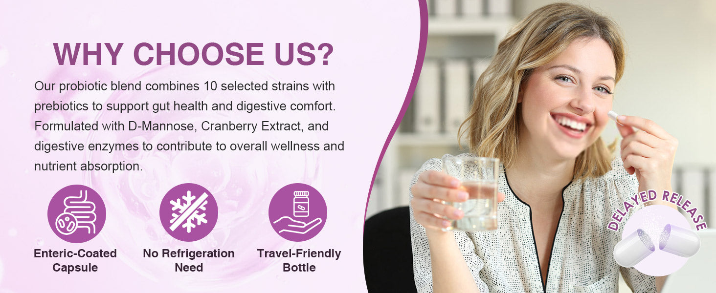 Advanced blend of 10 probiotics, prebiotics, D-Mannose, and Cranberry Extract for digestive and feminine health. Convenient, travel-ready, and shelf-stable capsules
